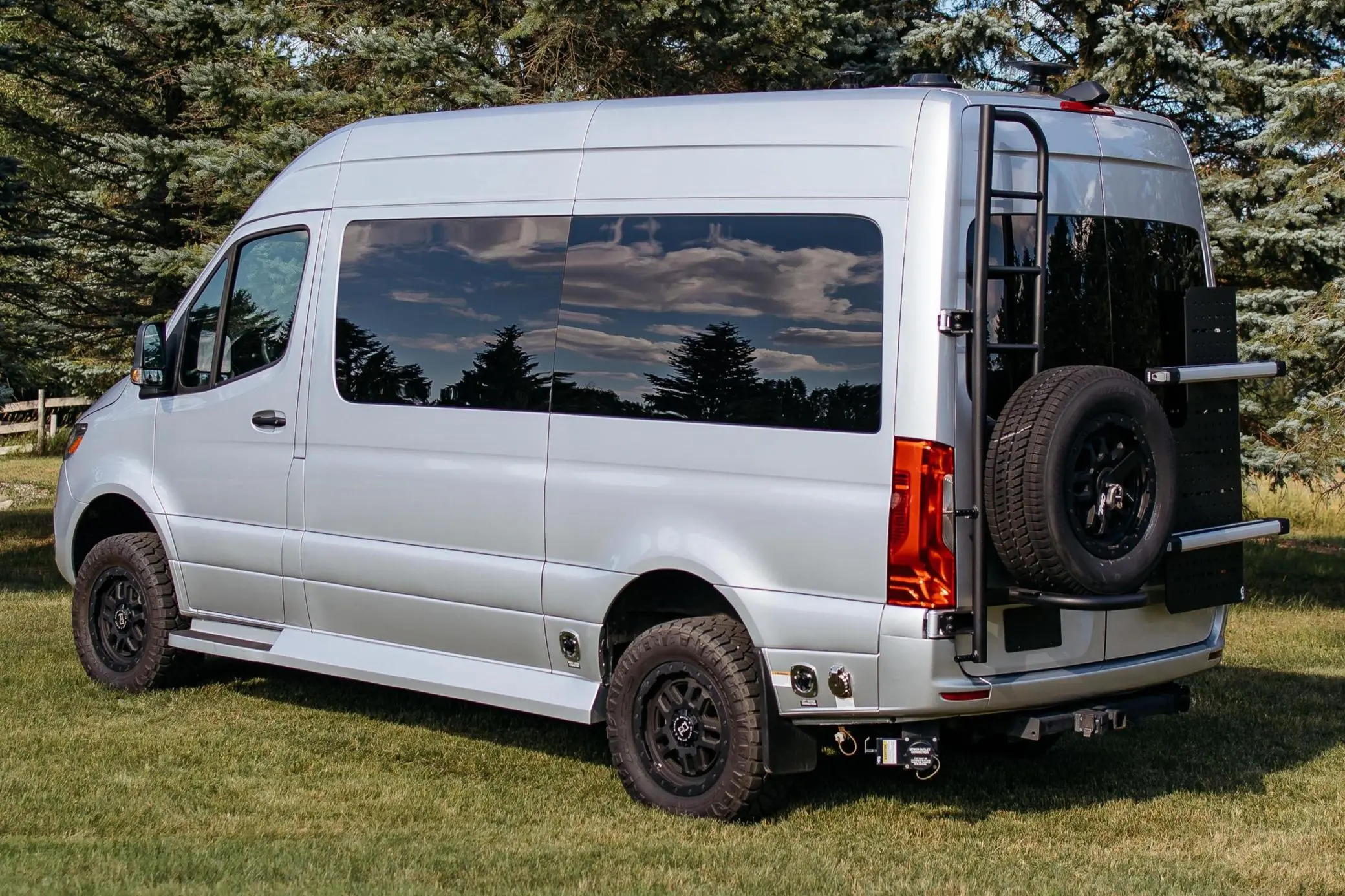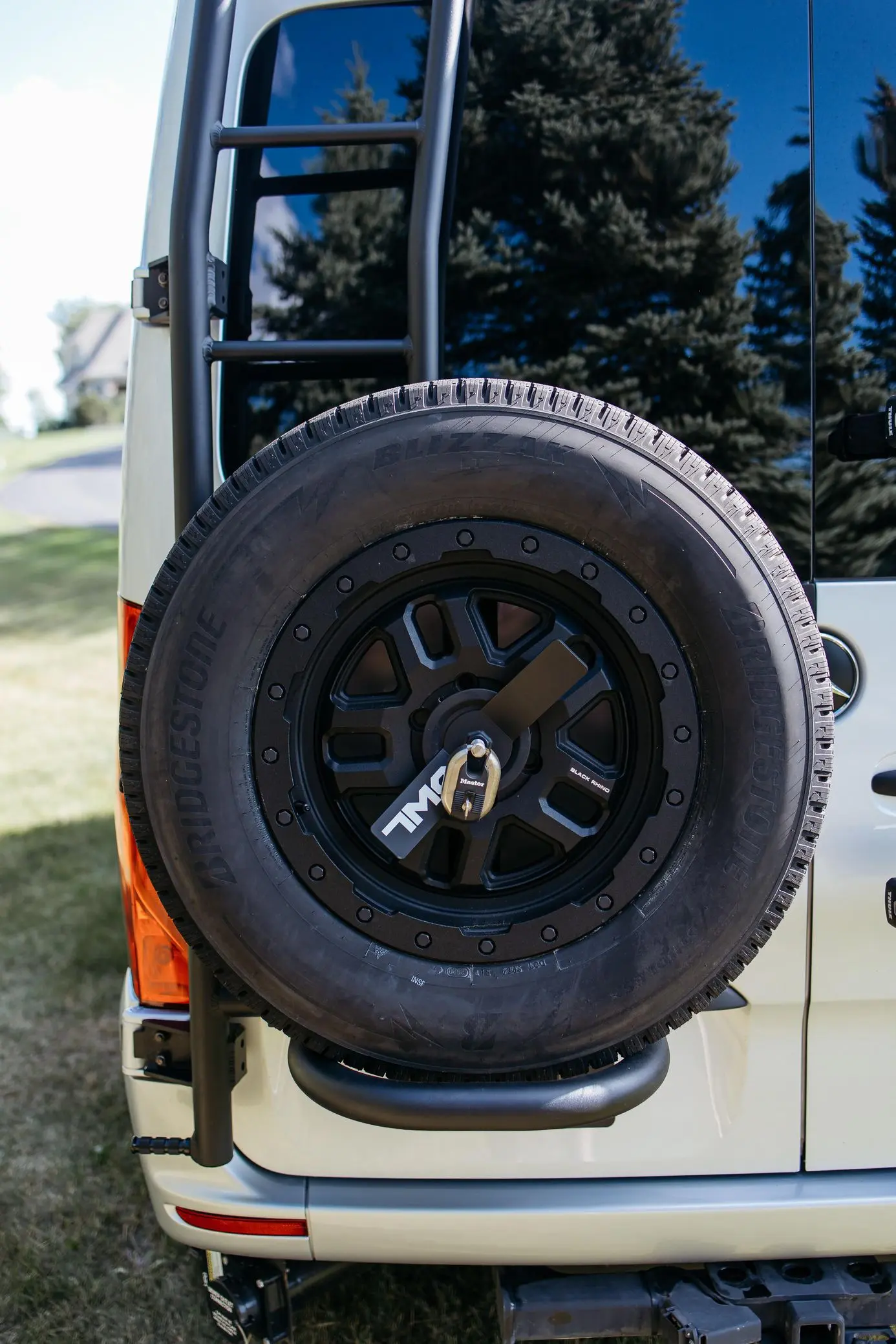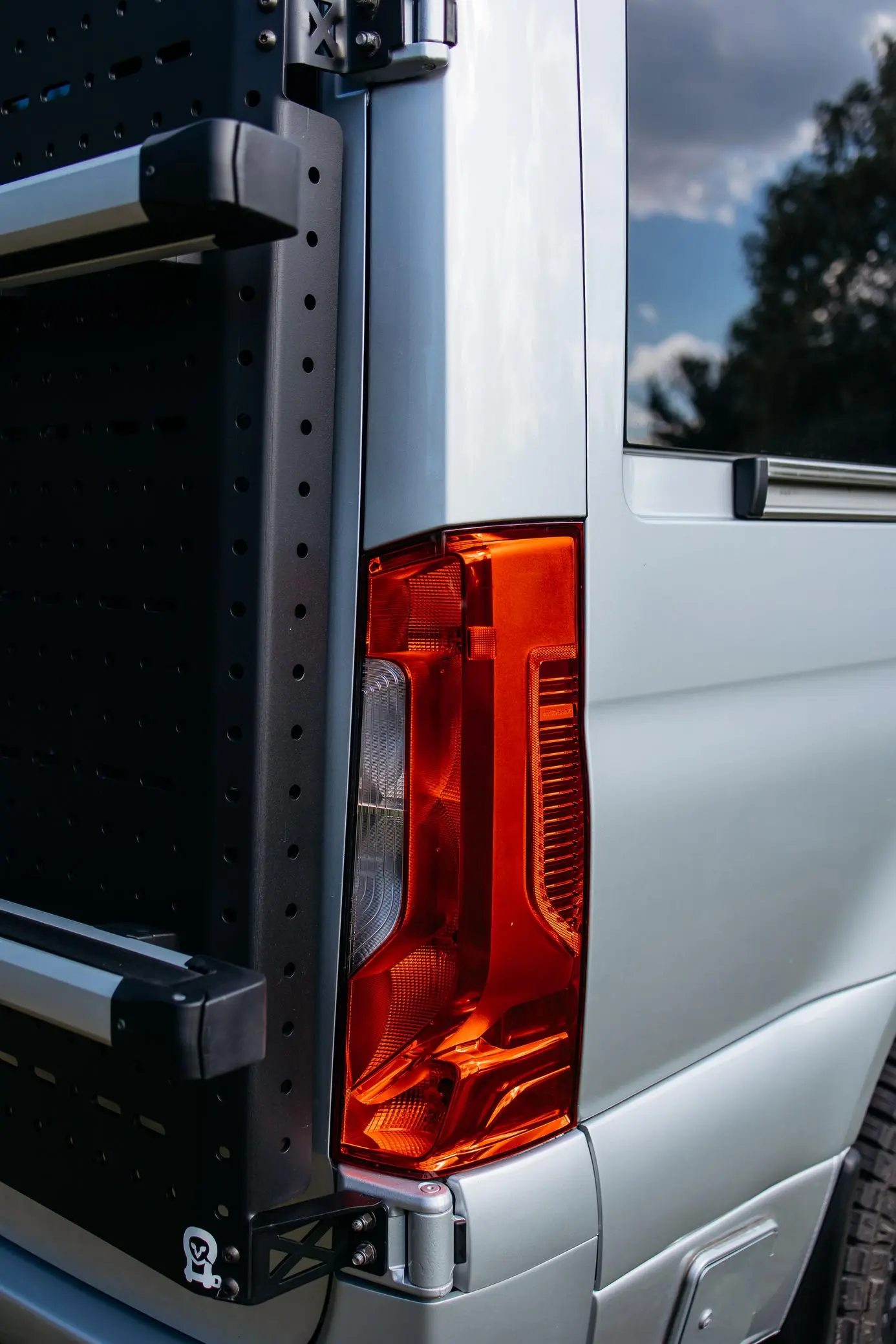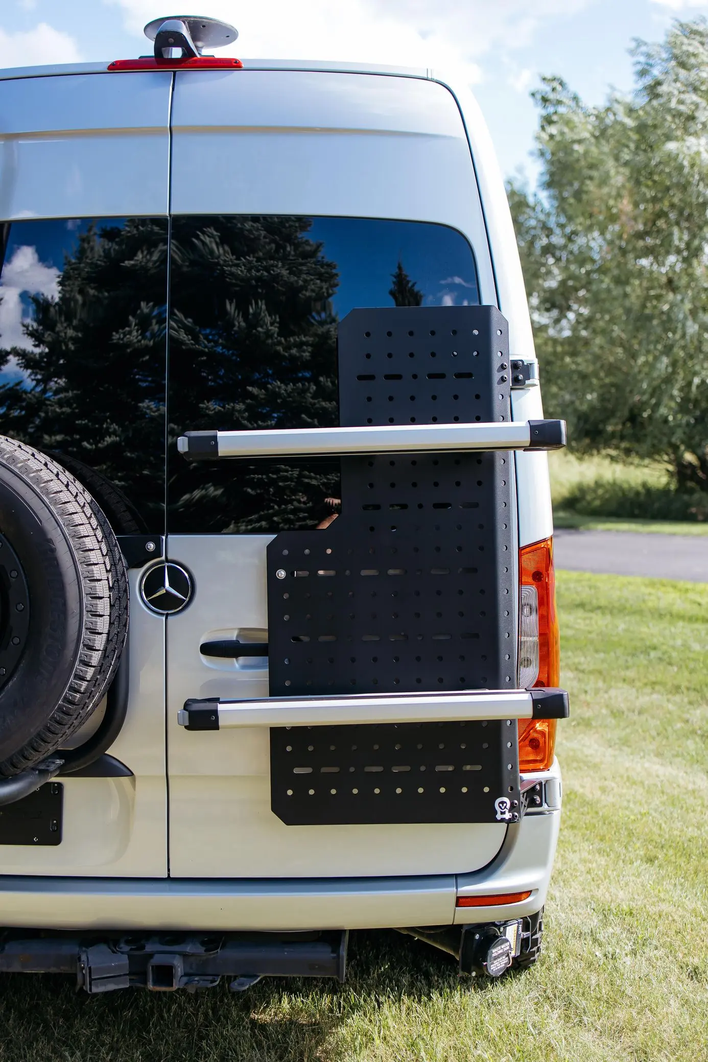 - Owl Vans rear-mounted rack and spare tire mount