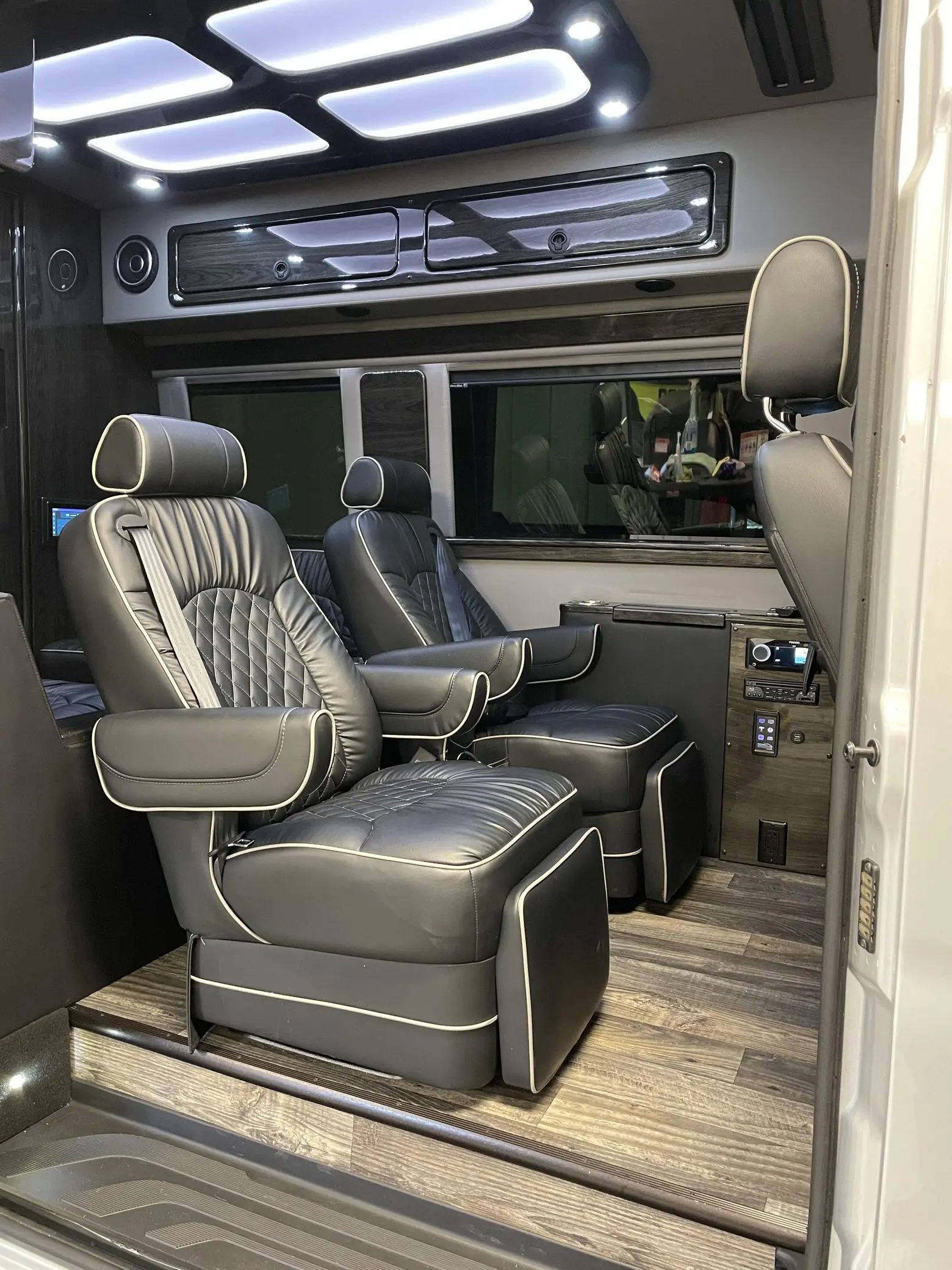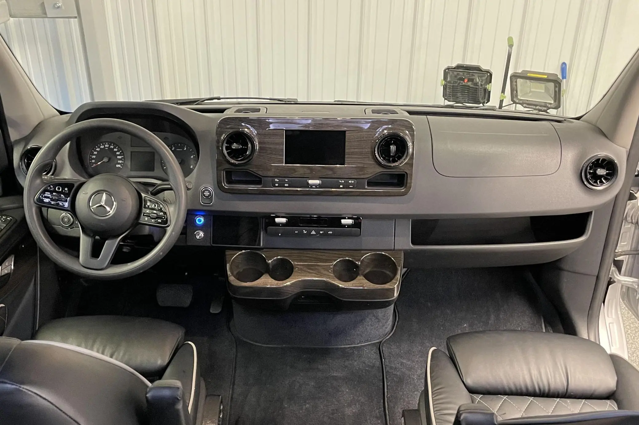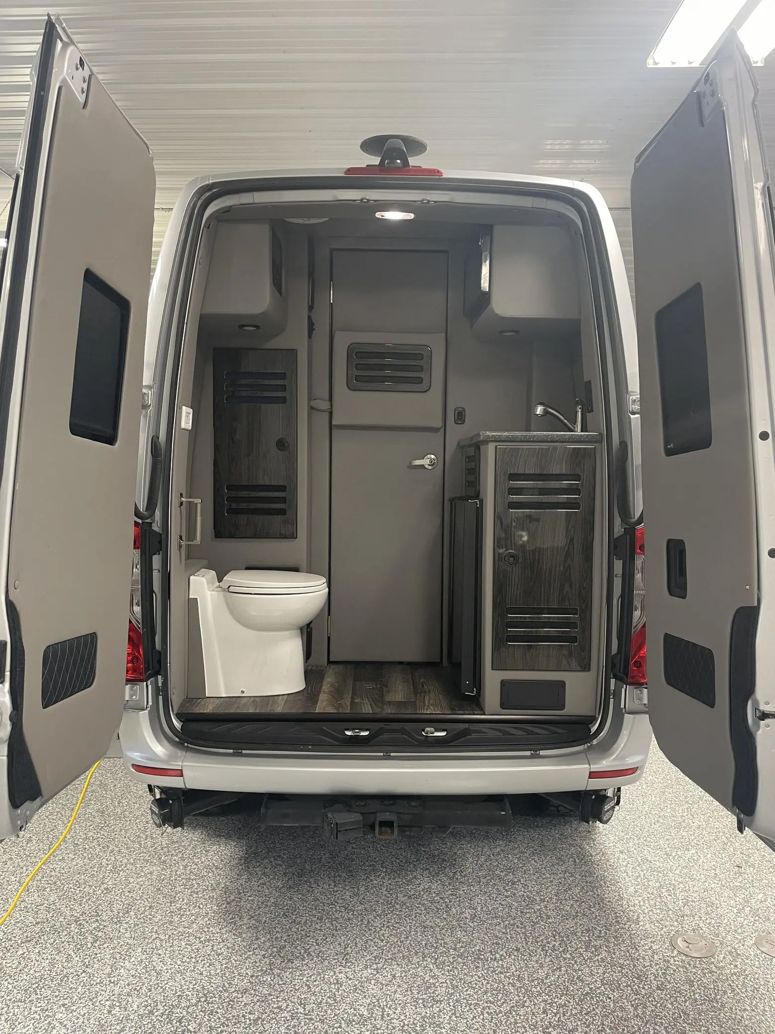 The interior has been extensively outfitted to Daycruiser 144 specifications, focusing on comfort and utility. Passenger accommodation is luxurious, featuring heated and power-adjustable individual front seats and “Maybach-style” second-row seats; notably, all four captain’s chairs include a massage function. The cabin is finished with soft-touch walls and ample overhead storage. For camping convenience, the van is equipped with a kitchenette featuring a counter, sink, microwave, and refrigerator, alongside a built-in toilet. The mechanical systems are ready for the road, featuring a dual-battery charging system, a heated water storage tank, and full fresh, gray, and black water holding tanks. A dedicated rear sound system and a trailer hitch round out the equipment list.