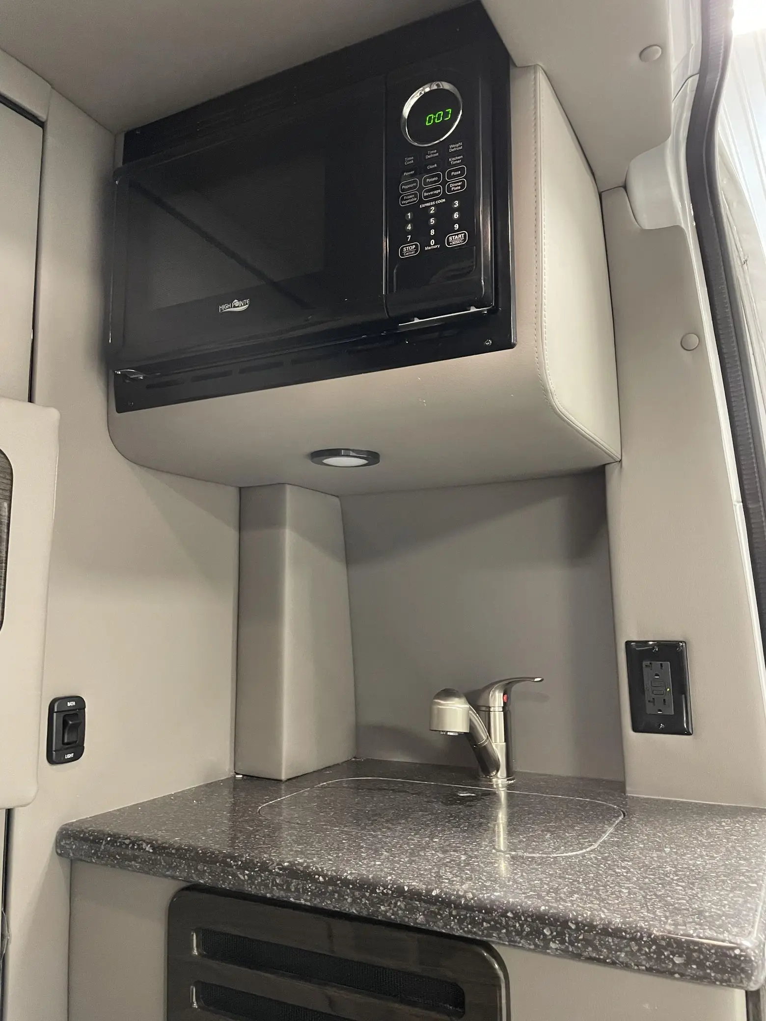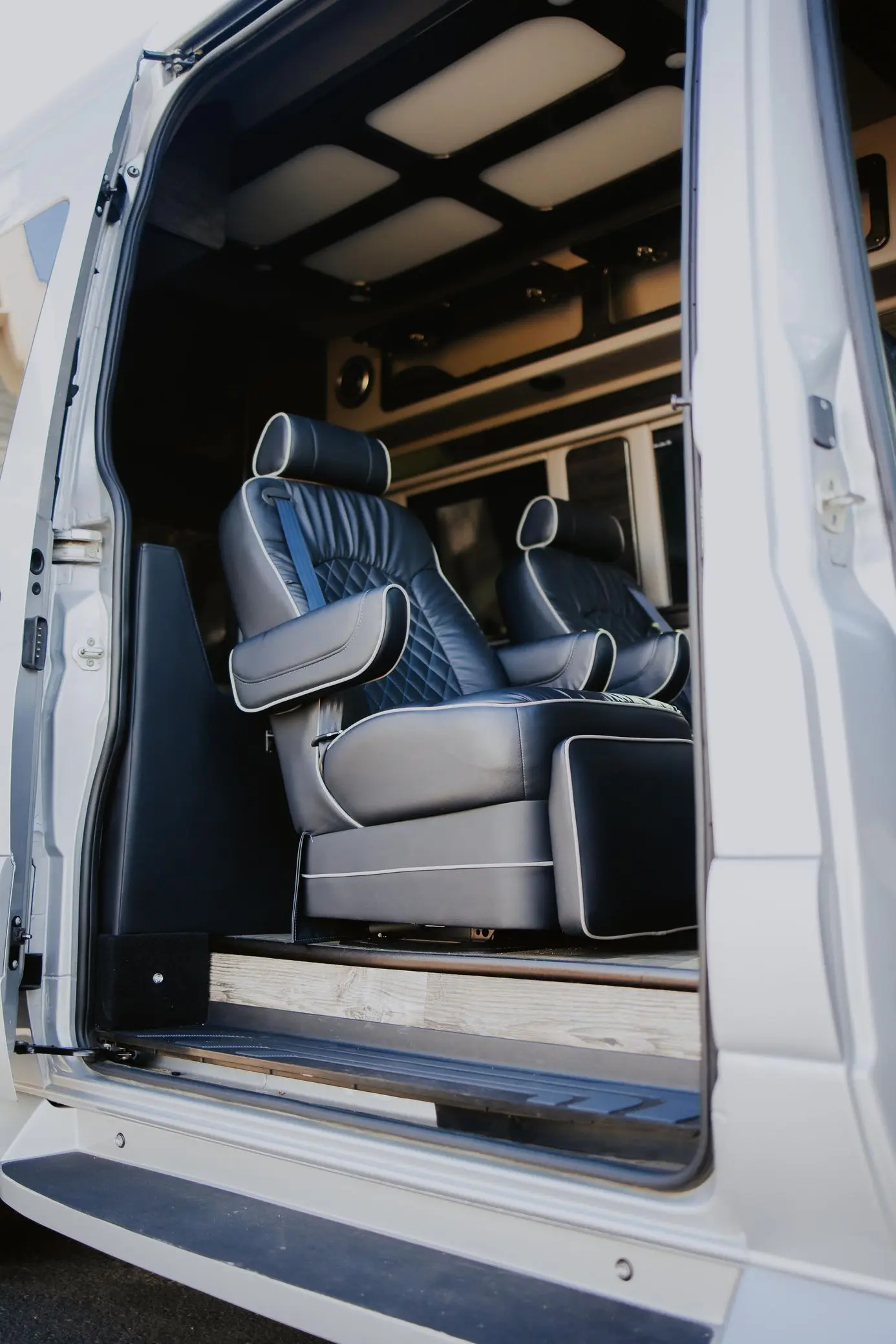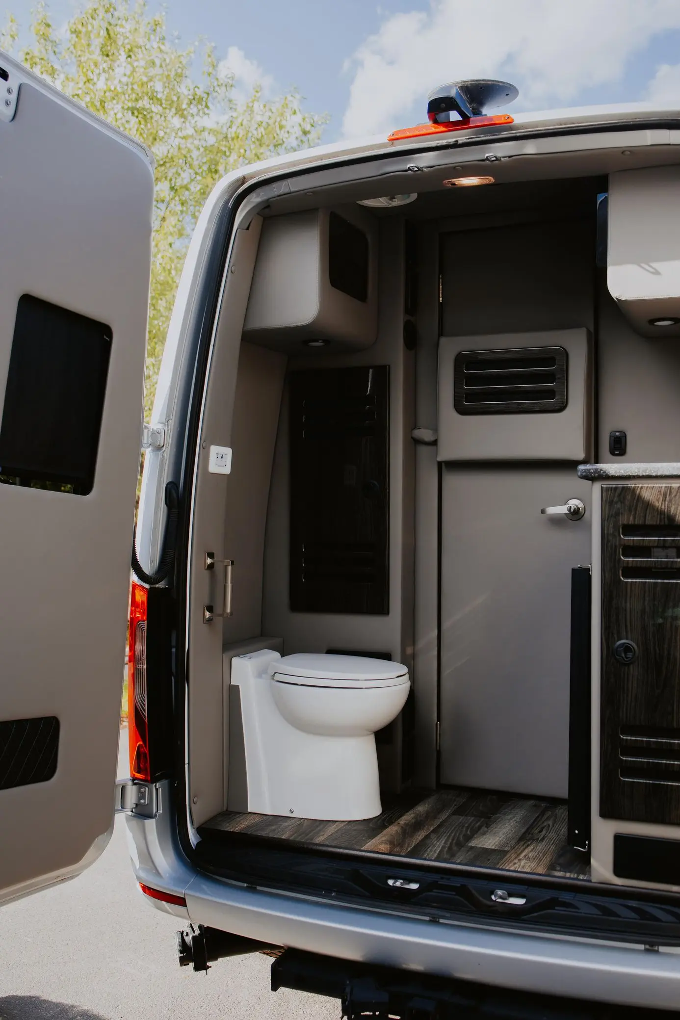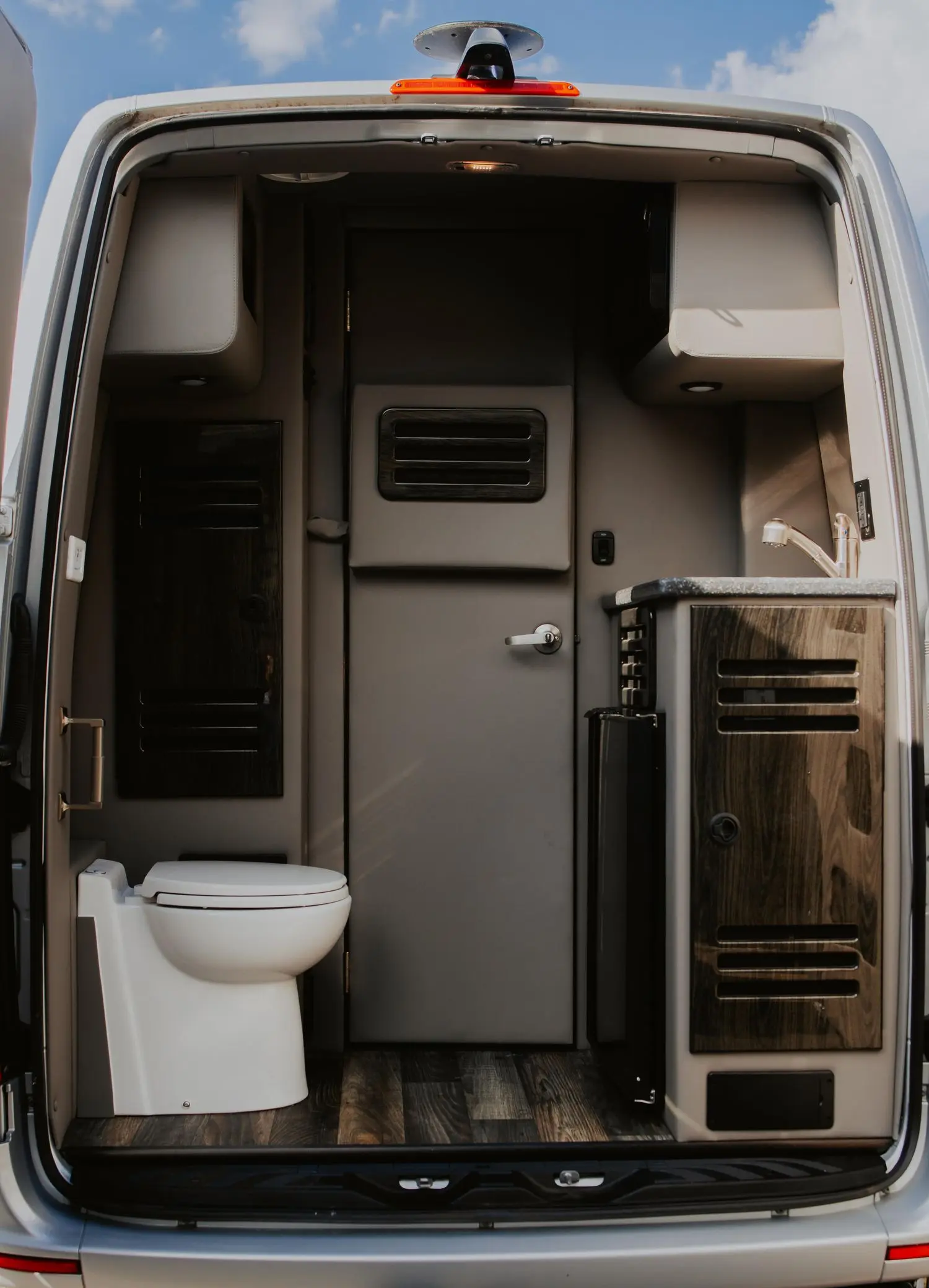 The interior has been extensively outfitted to Daycruiser 144 specifications, focusing on comfort and utility. Passenger accommodation is luxurious, featuring heated and power-adjustable individual front seats and “Maybach-style” second-row seats; notably, all four captain’s chairs include a massage function. The cabin is finished with soft-touch walls and ample overhead storage. For camping convenience, the van is equipped with a kitchenette featuring a counter, sink, microwave, and refrigerator, alongside a built-in toilet. The mechanical systems are ready for the road, featuring a dual-battery charging system, a heated water storage tank, and full fresh, gray, and black water holding tanks. A dedicated rear sound system and a trailer hitch round out the equipment list.
